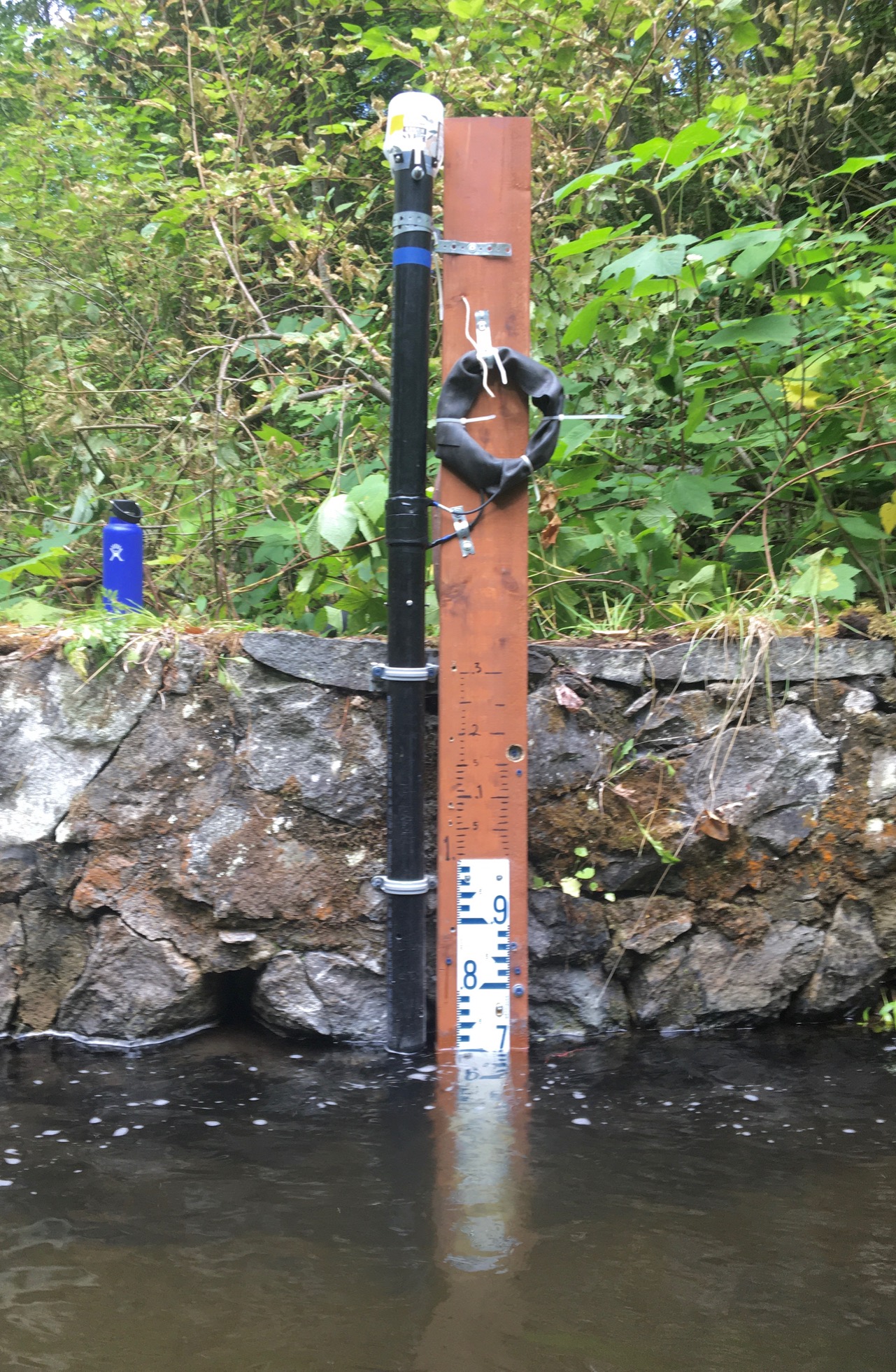 Photo of staff gauge and monitoring station on Cambridge Creek.